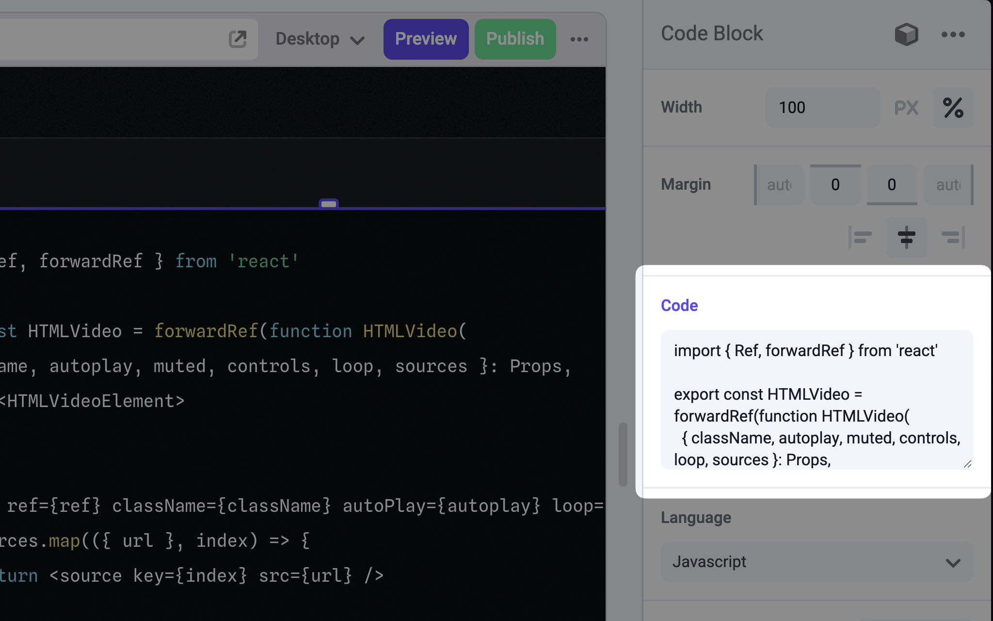 The following example adds a Text Area control to the Code prop of a Code Block component.